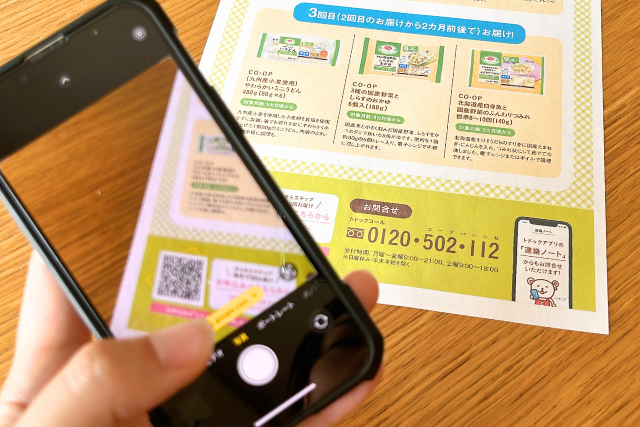 手元に「離乳食がトドック」のチラシがある人は、スマホで専用のQRコードを読み取ると申し込みページに移動します。