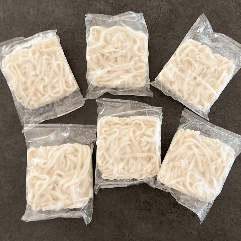 九州小麦を使用した小麦粉を食塩を使用せずに製麺。箸でも切れる位に柔らかくゆで上げた1個80gのミニうどん。うち袋のままレンジで手軽に調理できる。
